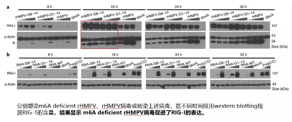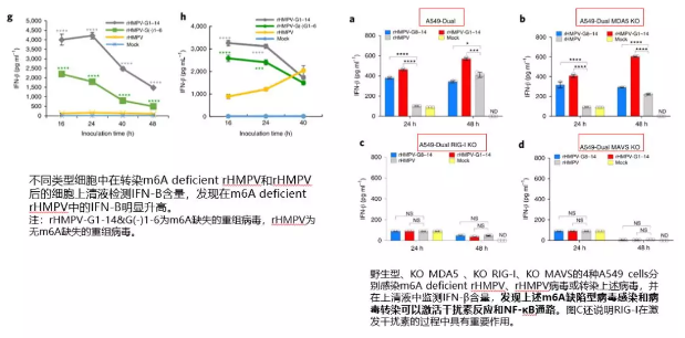 作者使用人類偏肺病毒(HMPV)作為模型,證明 m6A 修飾可作為病毒 RNA 上的分子標記物來躲避宿主對非自身 RNA 的先天性免疫識別。HMPV RNA m6A 修飾促進了 HMPV 的復(fù)制和基因表達。通過同義突變或去甲基化酶構(gòu)建 m6A 缺陷型重組 HMPV 病毒(m6A-deficient rHMPV),發(fā)現(xiàn)誘導(dǎo)了宿主Ⅰ型干擾素的分泌增加,并發(fā)現(xiàn)這取決于細胞質(zhì)中的傳感器 RIG-I。m6A-deficient rHMPV 在棉鼠體內(nèi)實驗表明干擾素分泌增加,毒性減弱,但保留了高免疫原性。