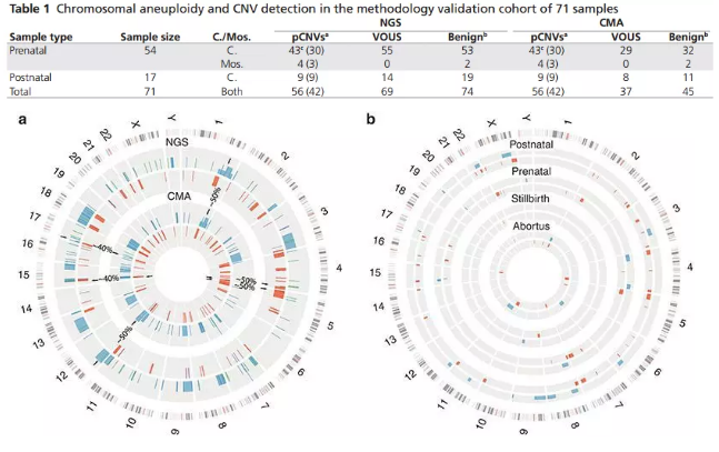 該團隊使用低覆蓋度的全基因組測序流程,對 570 名患者的多中心組進行了全基因組 CNV 分析(> 50 kb)和芯片檢測分析。根據(jù)美國醫(yī)學遺傳學和基因組學指南對 CNV(即致病性 CNV,pCNV)進行了分類。結(jié)果發(fā)現(xiàn),CMA 和基于 NGS 的方法在 71 個驗證樣本中的 pCNV 的結(jié)果一致(如下圖表)。