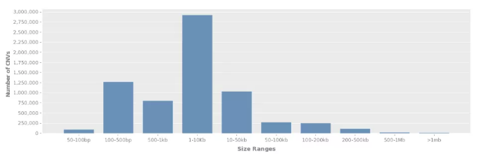 拷貝數(shù)變異數(shù)據(jù)收錄于 DGV 數(shù)據(jù)庫(http://dgv.tcag.ca/dgv/app/home),記錄了一系列基因變異與表型相關(guān)的信息,數(shù)據(jù)庫信息持續(xù)更新,截至 2020.2.19,DGV 數(shù)據(jù)庫收錄了總共 72 項研究 6359956 個樣本的 CNV 信息,大多數(shù)的 CNV 分布在 1 -10Kb,其次為 100-500bp。