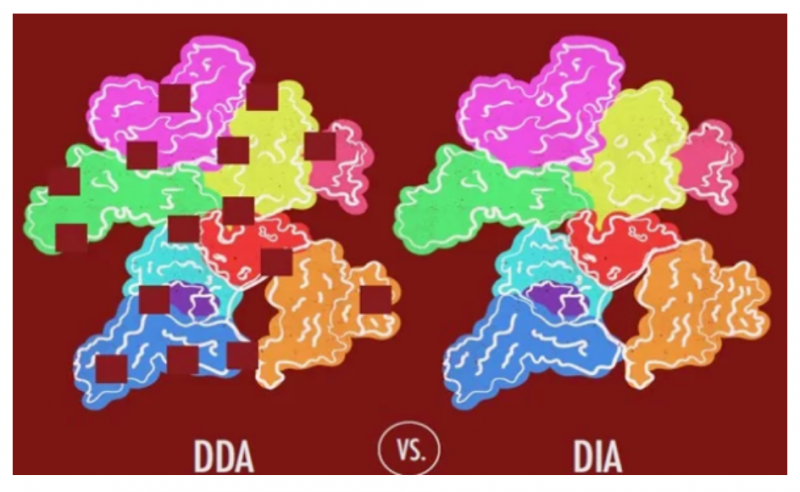 和上面的三種技術,非常高級似乎全能的 DIA 技術是升級換代式的進步。上面的三種,采用的是 DDA(data-dependent acquisition,數據依賴采集)數據采集方式,其策略是對響應高的部分母離子進行二級采集。而 DIA(Data Independent Acquisition,數據非依賴采集)采用了不同的數據采集模式:將質譜整個全掃描范圍分為若干個窗口,然后對每個窗口中的所有離子進行檢測、碎裂,從而無遺漏、無差異地獲得樣本中所有離子的信息,實現了從傳統(tǒng)的機槍掃射的方式向導彈轟炸方式的采集方式轉變。