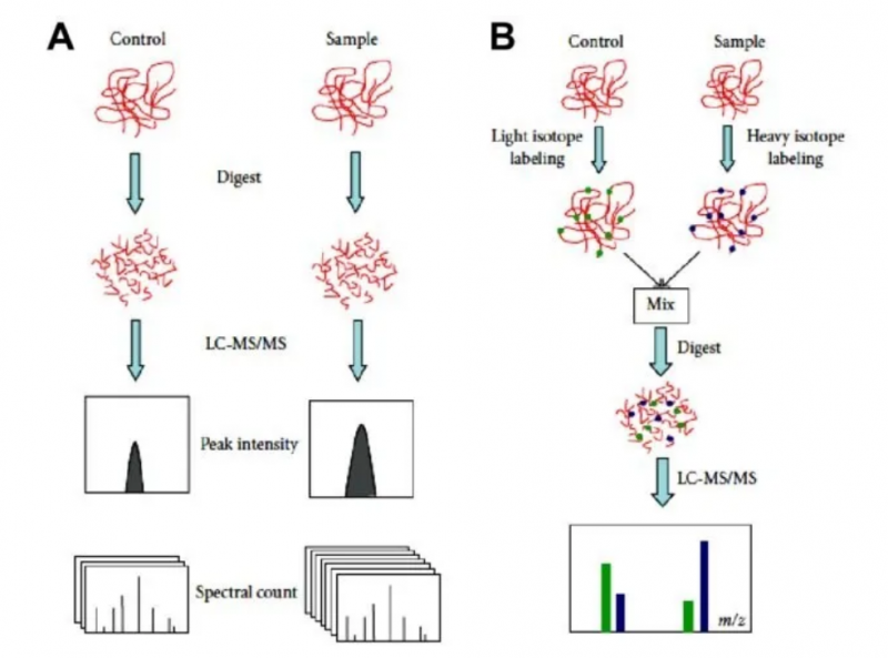 圖   label free(A) 和穩(wěn)定同位素標記定量(B) 之間的差異。Label free 定量包括兩個獨立進行的分析,然后進行比較。通過穩(wěn)定同位素標記的定量可以直接比較同位素標記的肽對。LC-MS/MS,液相色譜 - 串聯質譜聯用。