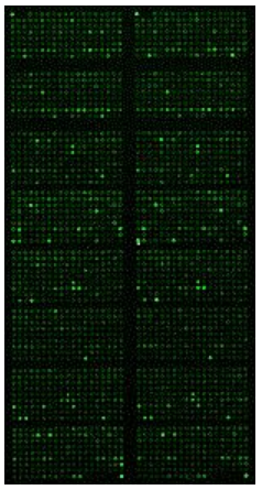 蛋白芯片 類似于基因芯片,固相的板面上有整齊地排列著一個一個小點,這些小點可能是各種抗體,也可能是各種基因組的蛋白質。通過抗原抗體及顯色反應,芯片上顯出或者亮或暗的點,以此篩查各種信號通路、蛋白表達。