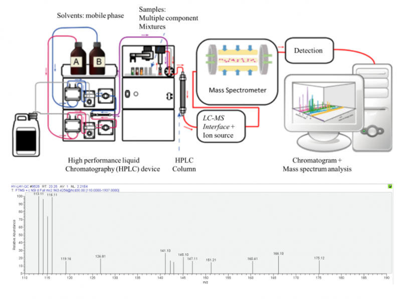 質譜技術: 通過對化合物分子進行電離,生成不同質荷比(m/e)的離子,經加速電場的作用進入質量分析器。在質量分析器中,再利用電場和磁場使發(fā)生相反的速度色散,將它們分別聚焦而得到質譜圖。質譜圖中的橫坐標表示離子的質荷比值,縱坐標表示離子流的強度。