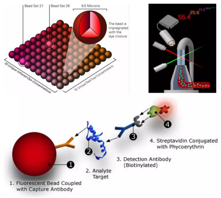 液相懸浮芯片是基于熒光編碼微球、雙激光檢測(cè)、應(yīng)用流體學(xué)等多項(xiàng)技術(shù),實(shí)現(xiàn)多分析物共同檢測(cè)的一種技術(shù),又稱為流式熒光技術(shù)或 xMAP(flexible Muti-Analyte Profiling)技術(shù)。