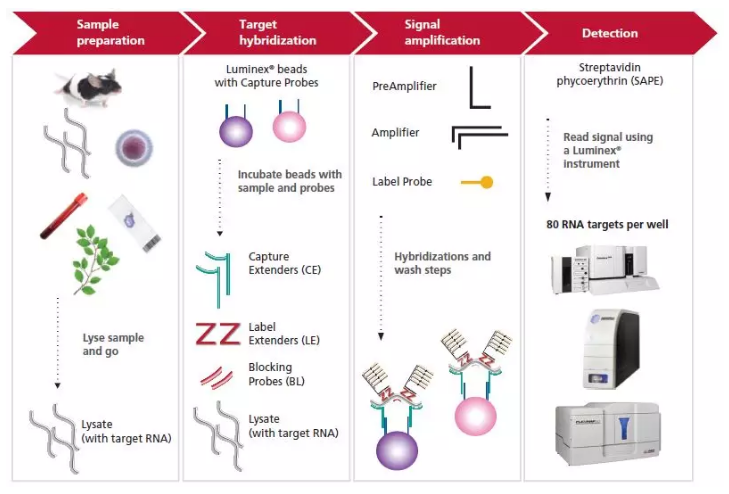 QuantiGene? Plex 高通量核酸定量研究系列產(chǎn)品是世界著名基因芯片制造商 Affymetrix 公司旗下 Panomics 的暢銷產(chǎn)品,除了利用 xMAP 技術(shù)外,還整合了西門(mén)子授權(quán)并經(jīng)過(guò)臨床驗(yàn)證的 branched DNA(bDNA)技術(shù),該技術(shù)可用于 Versant HIV、HBV 以及 HCV 的病毒載量分析,通過(guò)信號(hào)放大技術(shù),而非模板放大,bDNA 技術(shù)實(shí)現(xiàn)了對(duì)模板的直接定量檢測(cè)。QuantiGene? Plex 是驗(yàn)證表達(dá)譜芯片和二代測(cè)序數(shù)據(jù)、DNA 拷貝數(shù)檢測(cè)、臨床 FFPE 樣本和血液樣本的多基因檢測(cè)、信號(hào)傳導(dǎo)通路檢測(cè)以及轉(zhuǎn)化研究中生物標(biāo)志物與藥物靶點(diǎn)驗(yàn)證研究等的理想工具。